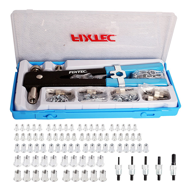 The kit includes five different sizes of nut rivet mandrels (M3, M4, M5, M6, M8) and a total of 80 rivet nuts in assorted sizes. This comprehensive set ensures you have the right tools for different riveting needs, enhancing the gun's versatility and utility.